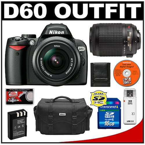The Nikon D60 Digital SLR Camera provides a resolution of 10.2 effective megapixels, Nikon's exclusive EXPEED image-processing concept, in-camera editing functions and a 3-area auto focus system. The camera offers continuous shooting at 3.0 fps, near instant power-up in just 0.19 seconds and high ISO sensitivity, all in a compact, lightweight body with a user-friendly ergonomic design.